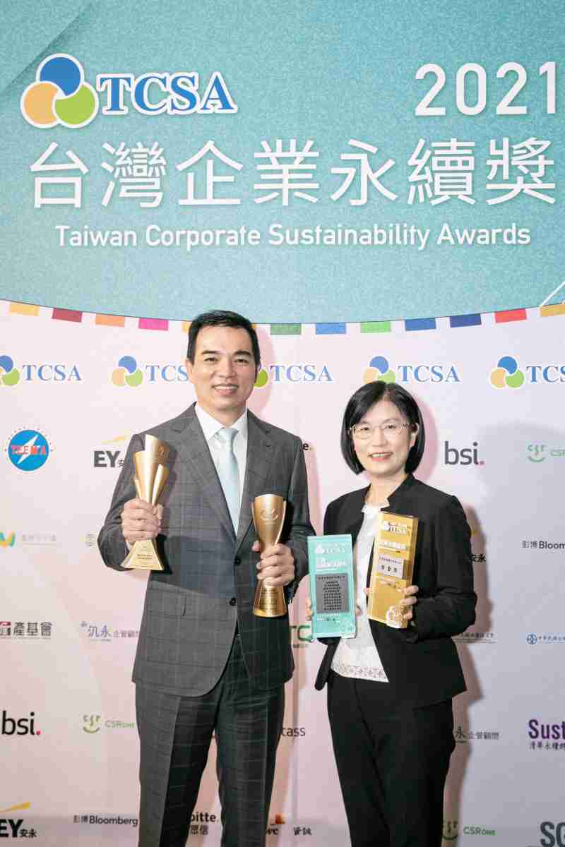 达在台湾永续奖所评比环境、、社会、、治理等各面向的永续绩效均获高度肯定 (左:彩霸王光电总经理暨营运长柯富仁,,,右:彩霸王光电永续长古秀华)