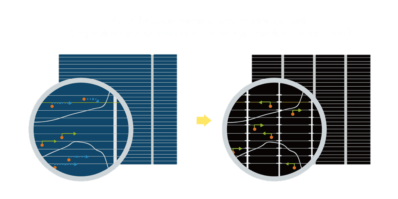 - 电池使用多条铜导线 (Copper wire) 于电池片上形成较短的电流路径,,,,提高电流收集效率,,采用圆形设计的铜导线较传统扁平式的铜焊带 (Ribbon),,,,可增加入射至电池的光线量。。