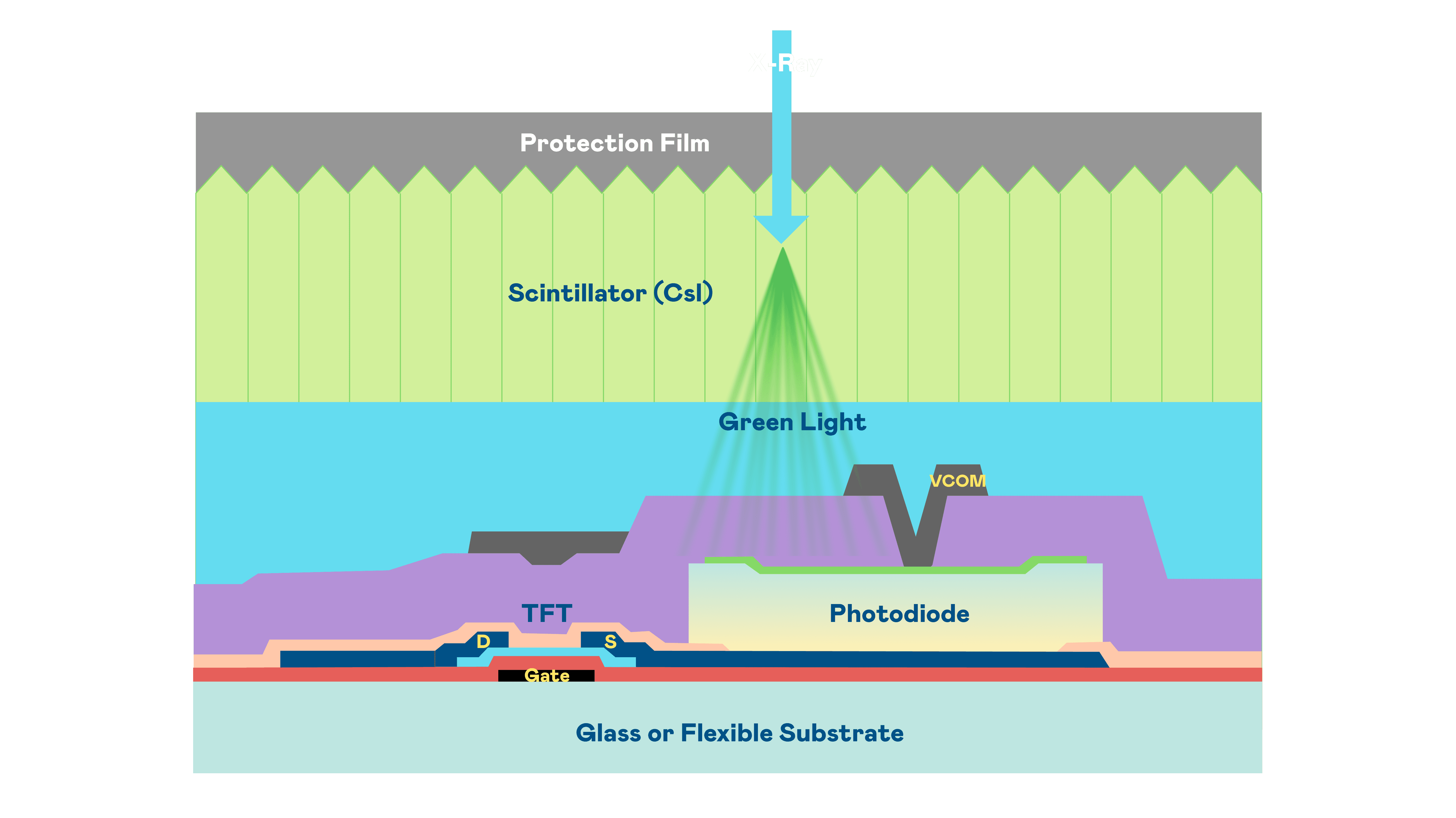 彩霸王的X光影像感测阵列使用薄膜电晶体 (TFT) 作为每个像素的读取开关,,搭配光电二极体(Photodiode)的光电转换元件,,,,用以感测X光影像讯号。。。。